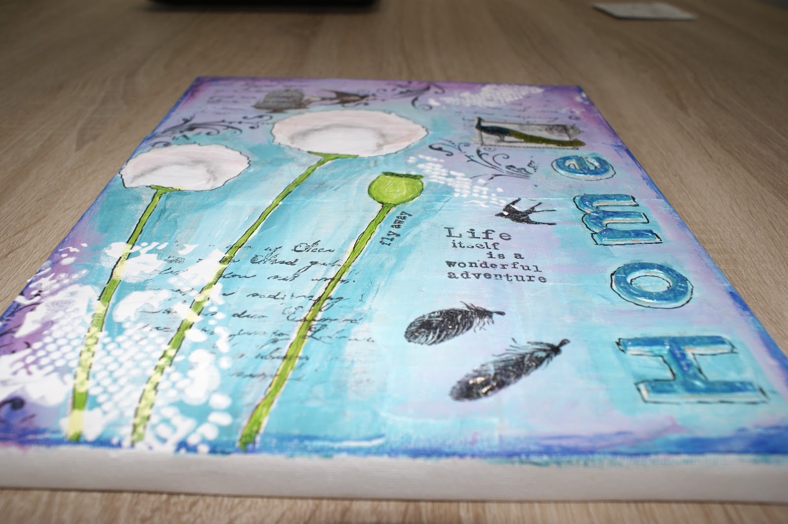 Den Hintergrund habe ich laut Anleitung mit Papierstücken und Buchseiten beklebt (leider sieht man das auf dem Foto nicht, die Muster kommen nur noch leicht durch), dann mit weißer Acrylfarbe leicht überstrichen.